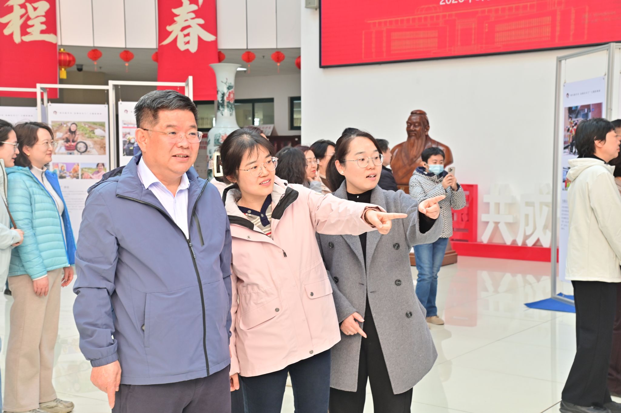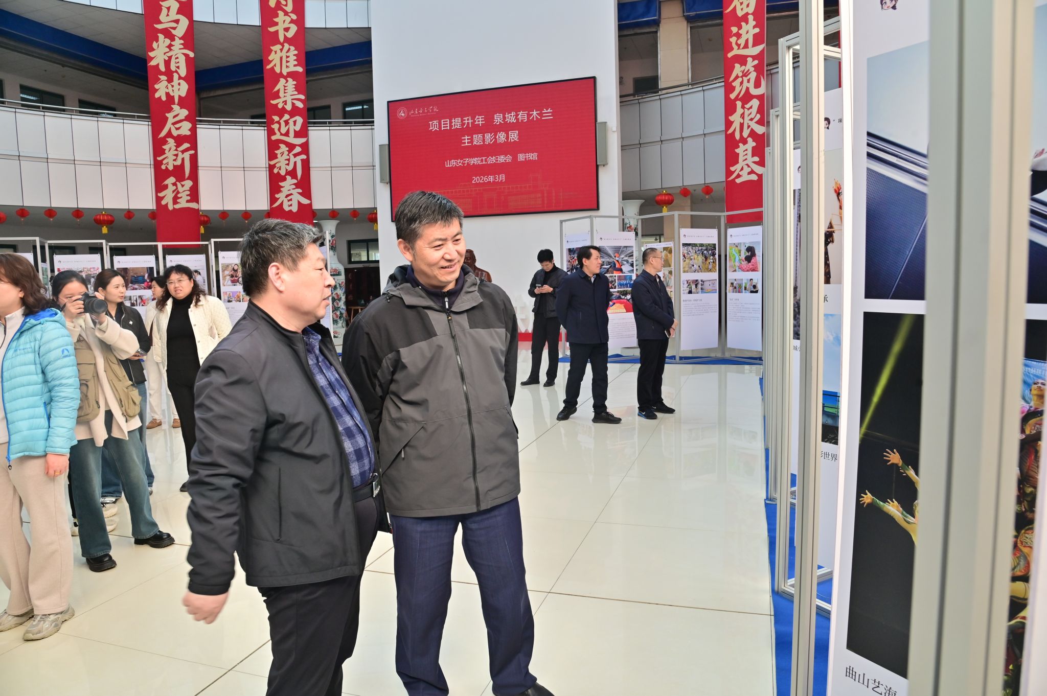 为庆祝第116个“三八”国际劳动妇女节,展现新时代女性奋进风采,凝聚师生发展合力,3月12日下午,由学校联合济南市妇联共同举办的“项目提升年 泉城有木兰”校园专场影像展,在图书馆A座大厅正式启幕。学校党委书记吕晓黎,党委副书记龙希利,党委委员、纪委书记杨恩红,党委委员、副校长田立新出席活动,并与机关分会、后勤服务保障分会的教职工们一同观展。