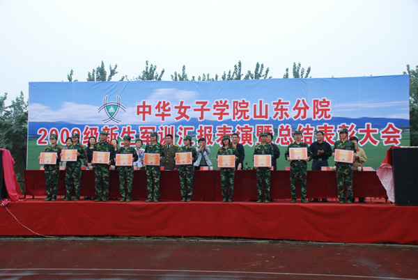 表演结束后,学院领导向济阳县人民武装部领导赠送锦旗,为受表彰的先进连队、先进个人和优秀宿舍颁发证书、奖状。济阳县人民武装部训练基地王建民主任、新生代表徐晓彤同学分别发言。