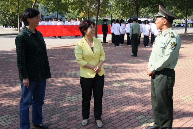 9月23日上午,学校党委书记孙秀丽,党委副书记、院长范素华,在党办院办、学生工作部(处)和部队负责同志的陪同下,亲切慰问2011级军训学生。