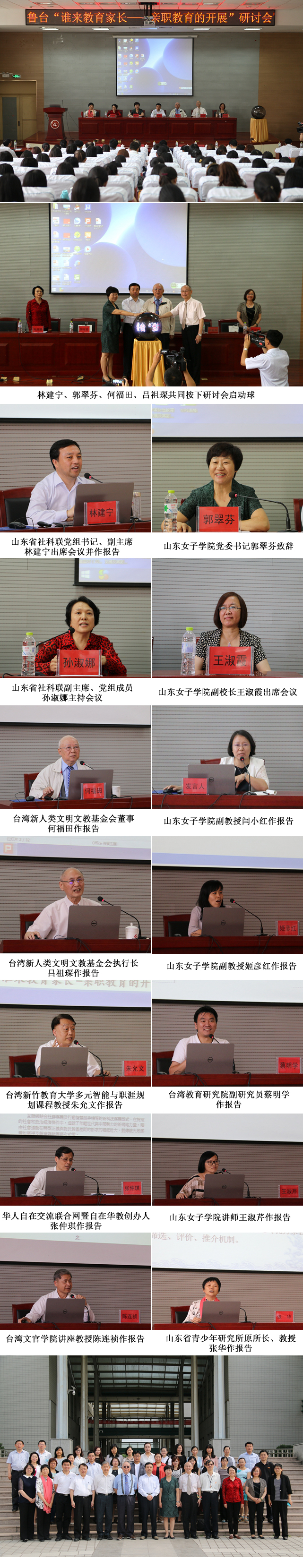 6月2日,由省社科联和台湾新人类文明文教基金会联合举办,山东女子学院承办的鲁台“谁来教育家长——亲职教育的开展”学术研讨会在山东女子学院召开。省社科联党组书记、副主席林建宁出席会议并作为专家发言,山东女子学院党委书记郭翠芬致辞,省社科联副主席、党组成员孙淑娜主持会议,山东女子学院副校长王淑霞出席会议。