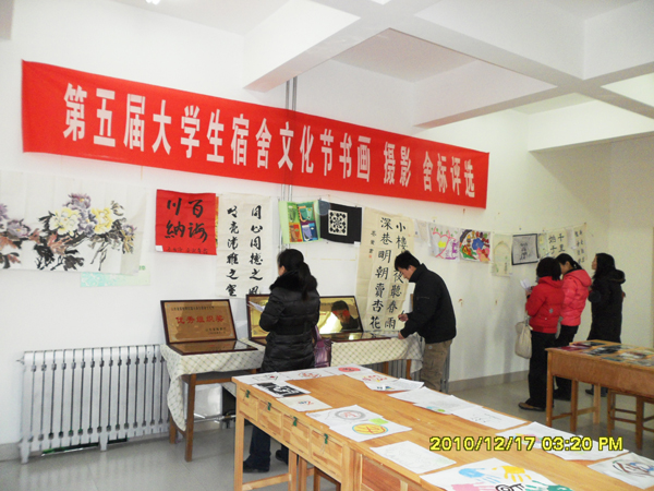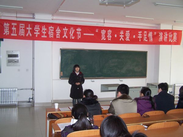 12月16日下午,由学生工作处主办、大学生自律会承办的第五届大学生宿舍文化节演讲和书画、舍标、摄影作品比赛作品评选举行,学生工作处副处长李君、董玉新及各学院辅导员代表出席了演讲比赛并担任评委。