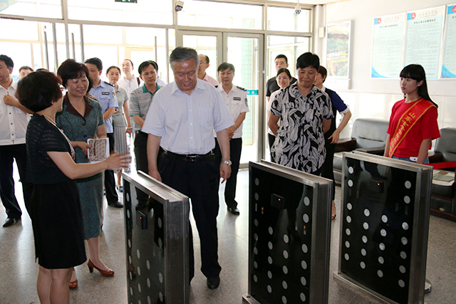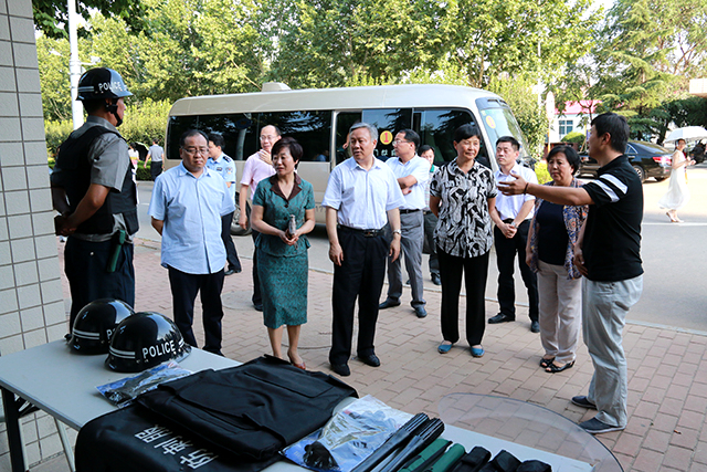 李占国一行先后察看了学校技防监控中心、防暴恐装备建设、消防展示室和学生公寓,听取了学校关于“平安校园”建设的工作汇报,了解学校安保队伍构成、人员配备和工作情况,详细询问了校园“人防、技防、物防”的落实情况。