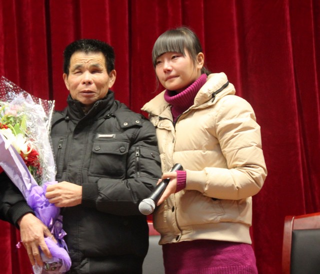 报告会在热烈的掌声和优美的背景音乐声中拉开帷幕。会上,李金苓以自己与父亲二十年来的坎坷经历做了催人泪下、感人至深的报告,并就相关话题做了现场访谈。李长有朴实、真挚的话语深深地感染了在场的每一位师生,同学们为这对父女的真情所感动,不时的报以热烈的掌声,现场同学也纷纷发言,发表自己的感受。在报告会现场,教育学院还专门成立爱心志愿团,学校纪委书记汪琦为爱心志愿者授旗并发表讲话。她指出:希望同学们要向道德模范李长有学习,要将这份爱心传递下去,提高青年人的素养;要像李金苓同学一样坚强自立,学会感恩,珍惜幸福。报告会在热烈的掌声中圆满结束。