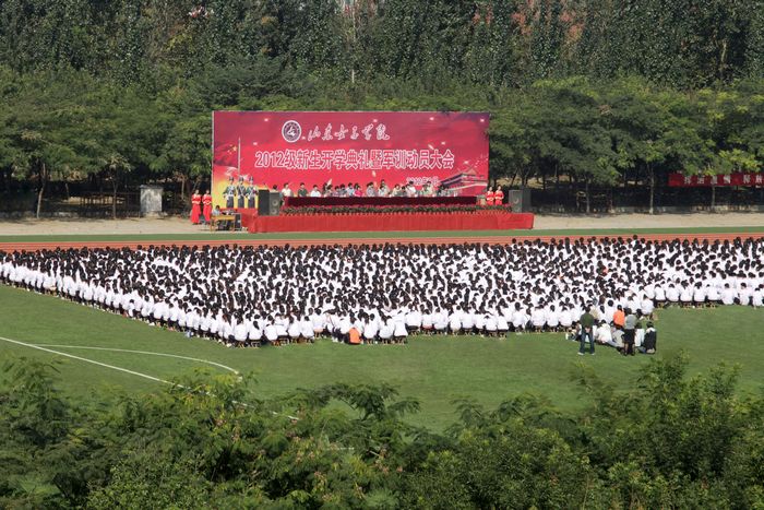 9月14日上午,阳光明媚,秋风送爽,我校2012级新生开学典礼暨军训动员大会在田径场隆重举行。学校领导孙秀丽、范素华、宿建沛、宋兆静、汪琦、贺兴利和中国人民解放军71939部队教导员王军出席了大会,全体教官、各部门、各单位负责人、2012级全体新生参加了大会。大会由副院长宋兆静主持。