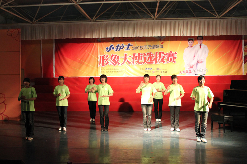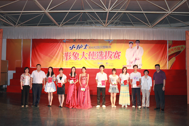 由山东省教育厅艺体卫办公室、山东省血液中心主办的“2010年校园无偿献血形象大使”选拔大赛近日在我校大学生活动中心成功举办。省艺体卫办公室王路主任、省血液中心朱永宝主任、省血液中心办公室李蓬主任、省血液中心体采科金孟民科长、我校学生处王宏玉处长、校团委李丽华副书记出席本次选拔大赛并担任评委。
