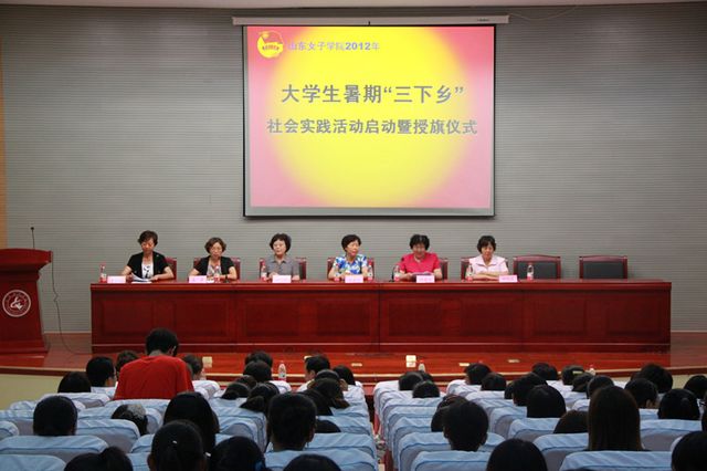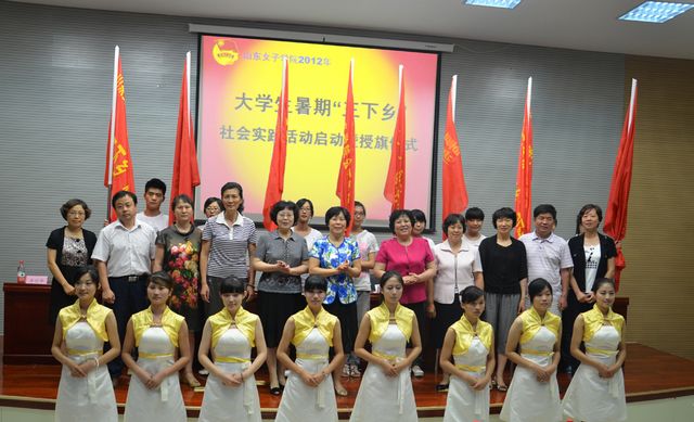 在热烈的氛围中,校领导为即将出征的社会实践的团队授旗,拉开了山东女子学院2012年大学生暑期“三下乡”社会实践活动的序幕。