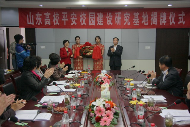 揭牌仪式在我校办公楼第三会议室举行。省委高校工委副书记(正厅级)齐秀生、校党委书记孙秀丽共同为山东高校平安校园建设研究基地揭牌。齐秀生副书记代表省委高校工委对我校“山东高校平安校园建设研究基地”的建立表示祝贺,他希望学校重视并加强对研究基地的建设和领导,同时希望基地深入研究平安校园建设的重大理论问题、广泛开展学术交流与合作、积极做好领导机关的参谋助手、加强基地自身建设。孙秀丽书记介绍了我校近年来平安校园的建设情况,她表示,学校将全力做好高校平安校园建设研究基地的建设和管理工作,积极探索平安校园建设的措施与对策,促进学校和谐健康持续发展,为山东省高校平安校园建设做出应有的贡献。