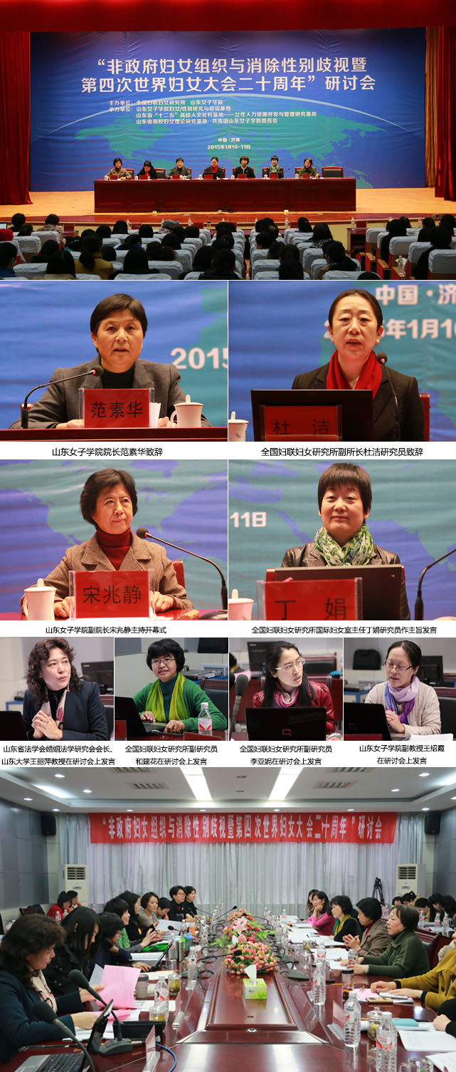 为了全面贯彻党的十八届四中全会精神,推动依法治国和男女平等与妇女发展的进程,迎接北京第四次世界妇女大会召开二十周年,全国妇联妇女研究所与山东女子学院联合举办的“非政府妇女组织与消除性别歧视暨第四次世界妇女大会二十周年”研讨会于2015年1月10-11日在山东女子学院召开。会议还得到了山东女子学院妇女/性别研究与培训基地、山东省“十二五”高校人文社科基地女性人力资源开发与管理研究基地、山东省高校妇女理论研究基地、共青团山东女子学院委员会的参与和支持。全国多个地区的专家学者和山东女子学院的师生共300余人参与了会议。山东省妇联副主席范晓丽出席会议。山东女子学院院长范素华和全国妇联妇女研究所副所长杜洁在开幕式上做了讲话。