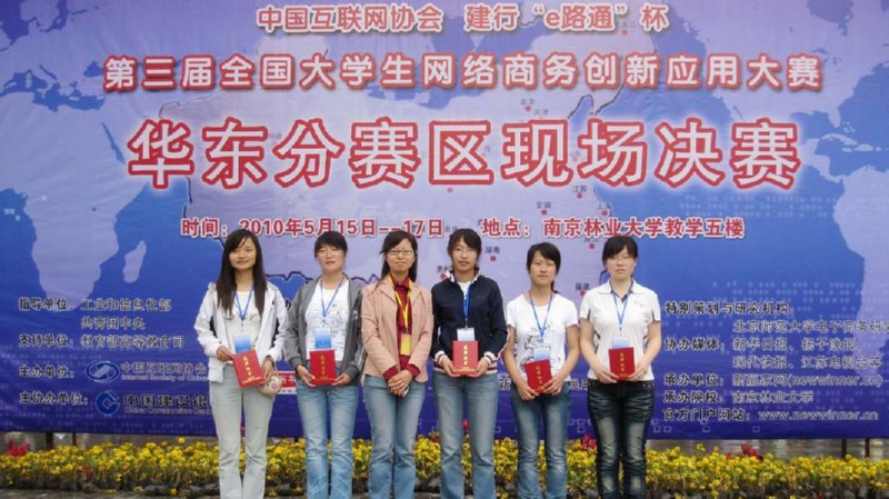 建行“e路通”杯第三届全国大学生网络商务创新应用大赛华东赛区现场决赛于5月17日在南京林业大学落下帷幕。经过紧张的角逐,我校信息技术学院电子商务专业丛俊、董晓静、罗琳琳同学组成的“E点”团队,和杨艳萍、韩立伟、孙爱梅、张华、吴宏宏同学组成的“我们e家”团队,分别获得华东赛区一等奖和二等奖。