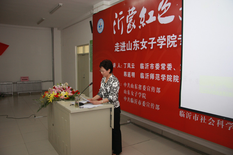 孙秀丽书记主持报告会。她说,沂蒙红色文化,底蕴深厚,沂蒙精神,感天动地。“沂蒙红色文化”作为齐鲁红色文化的主体和核心,已经成为一种特有的文化现象,成为沂蒙人民爱党爱军、无私奉献的永恒积淀和光辉诗篇。学校将借助“沂蒙红色文化进校园”这个平台大力弘扬沂蒙文化和沂蒙精神,在全校学生中形成诚实守信、艰苦朴素、勤奋学习、勇于创新、乐于奉献的良好氛围,为和谐社会培养出具有四自精神、掌握先进科学文化知识的女性人才。