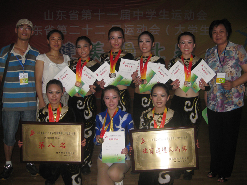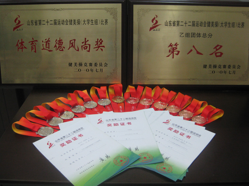 7月26-7月29日,山东省第二十二届运动会健美操(大学生组)比赛在淄博举行。经过四天紧张激烈的比赛,我校健美操代表队所参赛的四个项目均取得优异的成绩。其中,胡凌波获女子单人操的第一名,张娜、李梅宝、徐春霞、陈建宁、潘田田和黄超获健身健美操六人轻器械操的第二名和健身健美操六人徒手操的第三名,并以15分的成绩获得团体赛的第八名。