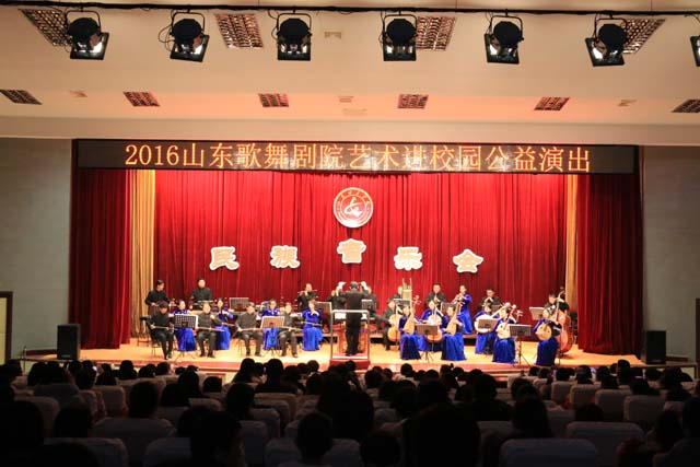 为响应习近平总书记在全国高校思想政治工作会议上的讲话精神,开展健康向上、格调高雅的校园文化活动,近日,山东歌舞剧院“艺术进校园”民族音乐会公益演出在我校图书馆报告厅隆重举行。本次活动由山东省委宣传部、山东省文化厅和山东省教育厅主办,来自山东歌舞剧院民乐团的艺术家们为在场的400余名师生献上了一场震撼人心的艺术盛宴。