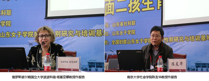 研讨会分为主旨报告、专题交流两个阶段。在主旨发言阶段,中国人民大学人口与社会发展学院杨菊华教授,中国妇女研究会副秘书长、北京大学社会学系佟新教授,俄罗斯彼尔姆国立大学波泼科娃·塔吉亚娜教授,南京大学社会学院陈友华教授以及山东省社科院人口学研究所所长崔树义研究员,河北大学人口研究所吕红平教授,全国妇联妇女研究所杨慧副研究员以及我校社法学院张雅维教授作了主题报告,分别从人口学、社会性别、法律、公共政策、公共卫生事业管理等视角,对全面二孩政策实施过程中女性面临的家庭与工作的矛盾、抚幼的公共服务需求、就业歧视加剧等问题进行了深入探讨,并从健全家庭支持政策、合理分配生育责任和完善生育保障制度等方面为保障全面二孩政策落地提出了建议。在专题交流阶段,菏泽学院法律系主任王念哲教授、山东交通学院工程机械学院分党委副书记周颜玲和我校会计学院孟贵珍副教授作了交流发言。