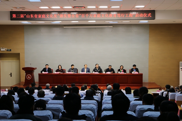 1月5日下午,第二届山东省家庭文化奖颁奖暨全省百千万家庭文化教育笃行工程启动仪式在学校图书馆一楼报告厅隆重举行。山东省政协原副主席栗甲,山东省政府研究室原巡视员、山东经济学院原副院长聂炳华,山东省家庭文化研究会专家委员会主席王天仁,山东省妇联儿童工作部副部长王爱峰,山东省青少年科学教育研究院副院长王娟,山东女子学院校长范素华、副校长王淑霞等领导同志出席仪式,山东女子学院科研处负责人、社会与法学院全体教师及文化传播学院、教育学院部分师生参加仪式。仪式由王天仁主持。
