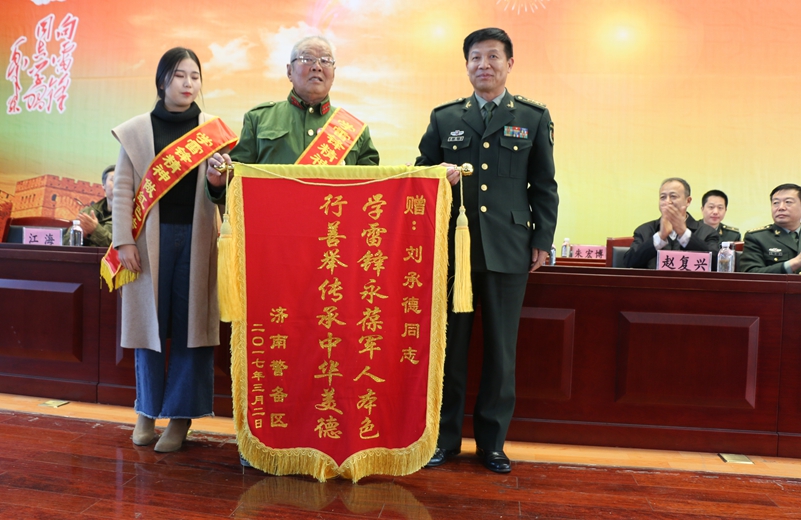 报告会上,李铁军代表济南警备区向雷锋战友刘成德老人赠送了锦旗。与会首长、领导向高校学生代表赠送《成德之道》图书和国防教育教学光盘。随后,《成德之道》的作者——《经济日报》高级记者管斌,刘成德老人的孙女刘蕊,全国文明家庭、道德模范房泽秋,退伍老兵、中国好人房泽岸,干休所卫生所所长袁野分别从不同角度、不同侧面,用生动的故事、真挚的情感,作了感人至深的报告。报告会结束后,李铁军在大会上宣布,全市高校征兵宣传工作正式启动,他号召广大同学们要有勇于担当、敢于奉献的精神,投身国防事业,报效祖国。