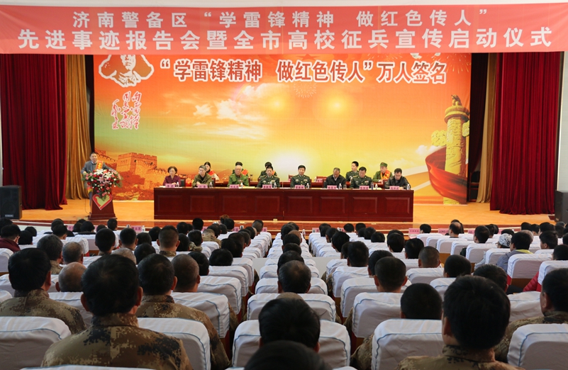 3月2日上午,“学雷锋精神 做红色传人”先进事迹报告会暨全市高校征兵宣传启动仪式在学校图书馆报告厅隆重举行。全国道德模范、雷锋的战友刘成德老人等事迹报告团成员以及山东省教育厅体卫艺处副处长赵复兴、济南警备区、济南市委市政府有关部门领导出席大会,济南市各区县人民武装部部长、民兵预备役代表,驻长清各高校学生代表,新闻媒体记者等近400人参加了此次活动。大会由济南警备区副政委李铁军主持。