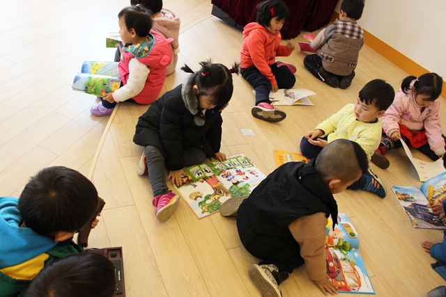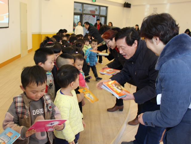 仪式上,贺兴利及相关负责人向小朋友们分发了图书。在幼儿园园长和老师的带领下,幼儿园的小朋友们有秩序地走上大厅讲台,有礼貌地向到园的老师们问好。图书馆原馆长朱海琳代表图书馆向小朋友们问好,为小朋友们介绍图书情况。拿到心爱书籍的小朋友们,或蹲或坐,立即兴致勃勃地阅读起来。