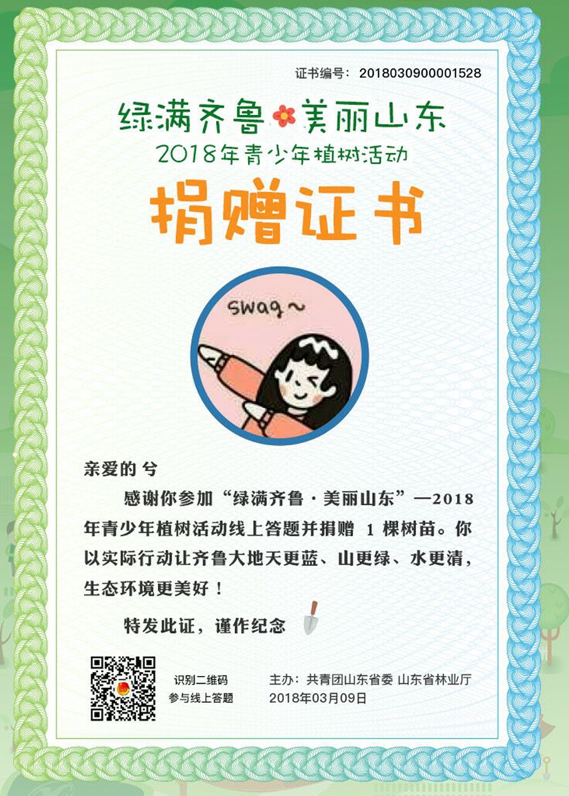 植树节前后,学校团委还通过微信公众账号推出“绿满齐鲁,美丽山东——动动手,捐赠一棵树”线上答题活动,答对8题及以上便有机会以个人名义捐赠一颗树苗。此次活动以“互联网+公益”的形式,将生态环境保护知识与捐赠树苗活动有机地结合起来。活动一经推出便受到广大学生的喜爱,答题获得的捐赠证书“火”遍朋友圈。