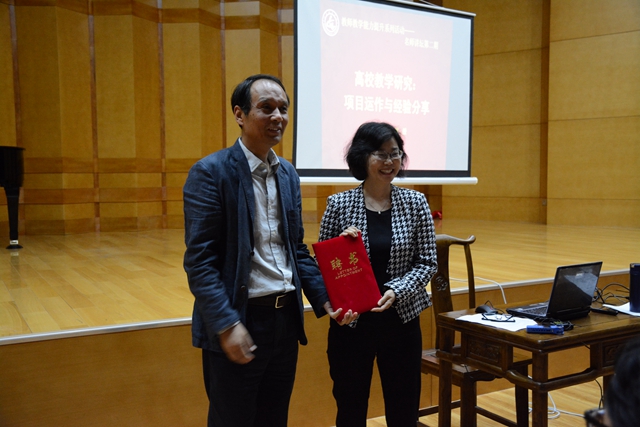聘任仪式后,佟月华教授作题为《高校教学研究:项目运作与经验分享》的报告。佟教授首先从宏观视角下讲述了高校教学研究项目的一般特征,指出了高校教师做教学研究的重要意义;然后结合2015、2016年山东省教改立项情况,分析了宏观、中观、微观层面的教改项目类型特点,同时就我校2018年教改立项类别和相关要求,分享了确定选题、实施研究、团队协作等方面的宝贵经验,并结合3个具体申报实例阐述了教学改革项目申报的注意事项;最后,佟教授向大家介绍了教学研究项目验收的一般流程,就高校教师如何准备教研项目验收及教研成果的成果体现提出建议。