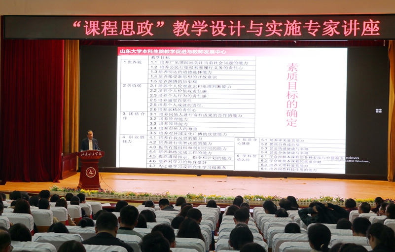 10月18日下午,学校在图书馆二楼报告厅举办“课程思政”专题讲座。山东大学本科生院教学促进与教师发展中心副主任李赛强教授受邀作题为《“课程思政”教学设计与实施》的专题讲座。副校长刘正林出席并主持会议,教务处、宣传部、学生处、教学质量监控与评估处,各二级院部党政负责人、辅导员及部分专任教师共380余人参加了活动。