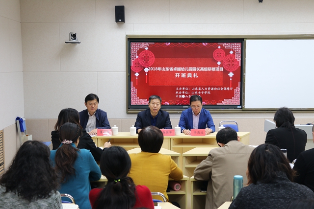 10月24日上午,2018年山东省卓越幼儿园园长高级研修班开班典礼在我校博雅楼B201室举行。学校校长盛国军、教育学院相关负责人和部分教师参加开班典礼。典礼由教育学院院长董吉贺主持。