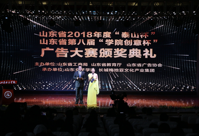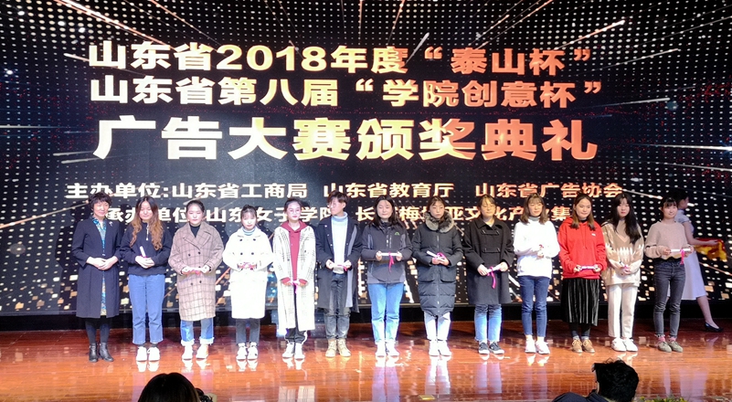 11月8日下午,山东省2018“泰山杯”、山东省第八届“学院创意杯”广告大赛颁奖典礼在我校成功举办。省政协常委、中国广告协会副会长、省广告协会会长王百忠,省广告协会副会长、山东工艺美术学院党委副书记苗登宇,省市场监管局广告处处长孙玉芹,我校校长盛国军、副校长侯素美出席典礼。省广告协会理事、兄弟院校获奖人员、艺术设计学院师生参加了典礼。