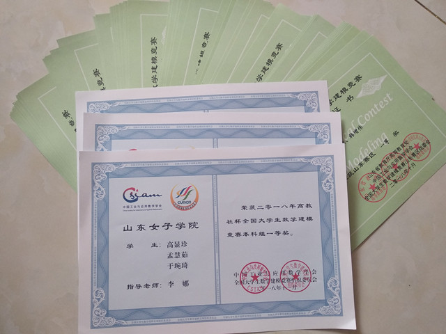 在2018年“高教社杯”全国大学生数学建模竞赛中,我校学生取得了全国一等奖1项、全国二等奖2项、省级奖项31项的历史最好成绩,为学校赢得了荣誉。此外,我校学生获山东省大学生数字媒体创意大赛一等奖1项、二等奖6项,在第六届全国高等艺术院校中国声乐展演总决赛中获金奖,在全国高校数字艺术设计大赛、全国大学生跆拳道锦标赛、全国英语演讲大赛等竞赛中屡获佳绩,这些成绩的取得是学校高度重视、教师默默付出、学生拼搏努力的结果,展现了女院人团结奋进、自强不息的良好风貌。