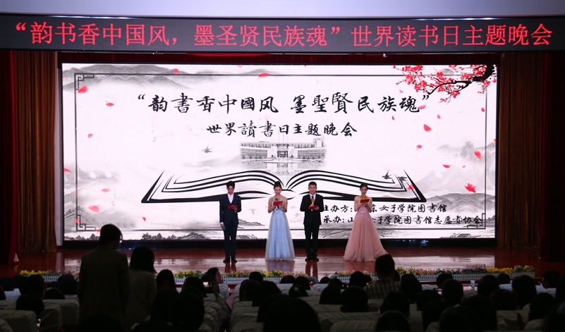 4月20日,为弘扬优秀的中华文化,增强“全民阅读”的宣传力度,学校图书馆在第二报告厅举办“韵书香中国风 墨圣贤民族魂”世界读书日主题晚会。学校党委副书记王淑霞出席活动,党委宣传(统战)部、图书馆相关负责人和驻长清大学城四所兄弟院校的图书馆学生组织代表以及我校师生共400余人共同观看了本次晚会。