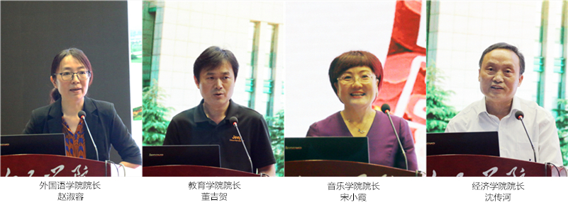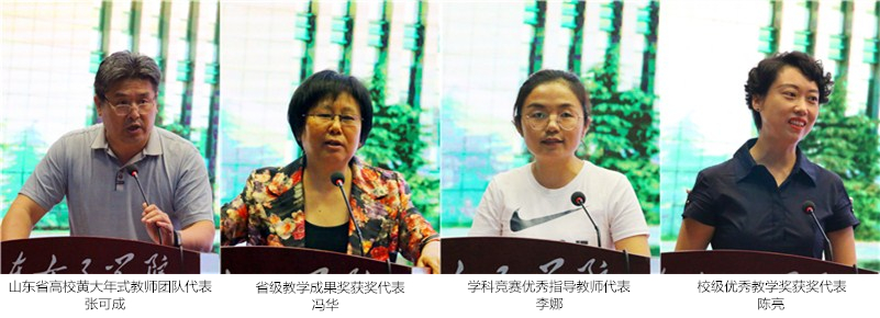 山东省高校黄大年式教师团队代表张可成、省级教学成果奖获奖代表冯华、学科竞赛优秀指导教师代表李娜、校级优秀教学奖获奖代表陈亮作典型发言。外国语学院院长赵淑容、教育学院院长董吉贺、音乐学院院长宋小霞、经济学院院长沈传河、社会与法学院副院长闫小红、数据科学与计算机学院副院长孙洪峰、马克思主义学院院长王鲁等七位同志围绕会议主题,结合学院工作实际,从教学改革、人才培养、师资队伍、专业建设和校企合作等方面进行了工作交流。