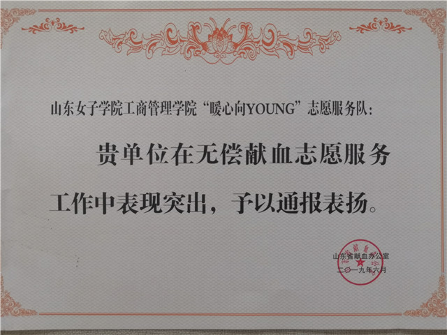 近日,山东省2019年世界献血者日庆祝活动在济南举行,会上对2018年度山东省无偿献血表现突出集体及个人进行了表彰。学校工商管理学院“暖心向YOUNG”志愿服务队获评“山东省无偿献血志愿服务集体 ”,21名学生获得“爱心大学生”荣誉称号。