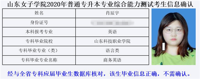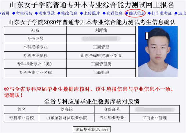 我校2020年专升本专业综合能力测试自荐考生网上报名已于2月8日17点截止,经过与省教育厅专科应届毕业生数据库进行比对,有部分考生信息填写有误,须报名自荐考生自行进行报名信息确认,具体说明如下:
