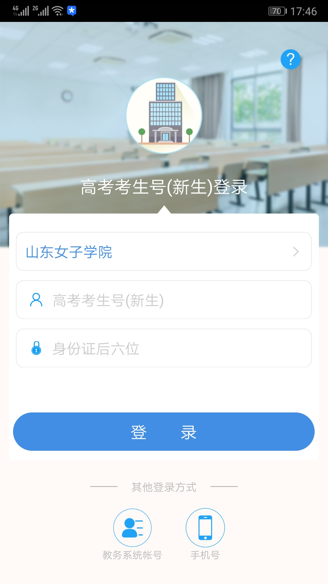 安装完成后,在登录界面,选择【高考考生号(新生)】登录。学校选择“山东女子学院”;专升本录取新生请输入专升本考生号;密码为身份证后六位(身份证最后一位是X的,输入大写X)。