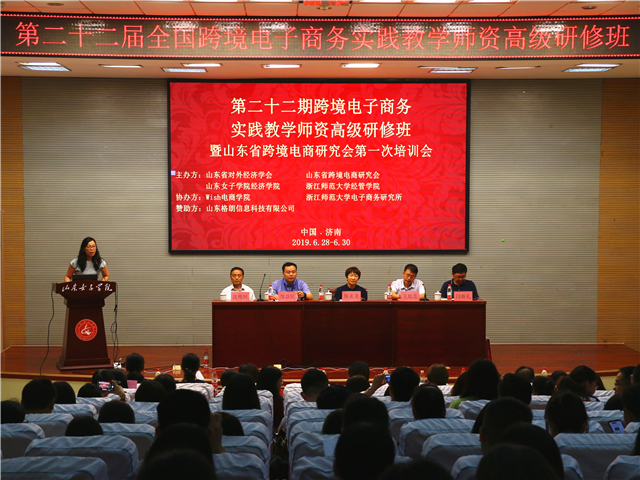 2019年6月29日上午,由山东省对外经济学会、山东省跨境电商研究会、山东女子学院经济学院、浙江师范大学经济与管理学院等单位组织的第二十二期全国跨境电子商务实践教学师资高级研修班开班仪式在学校图书馆一楼报告厅举行。学校副校长侯素美出席开班仪式并致辞。山东省对外经济学会会长、山东省跨境电商研究会会长、山东财经大学国际经贸学院院长王培志教授、浙江师范大学经济与管理学院院长助理邹益民教授、长清区商务局副局长闫新礼等出席会议,省内外高校及企业教师70余人参加了研修班。开班仪式由学校经济学院负责人主持。