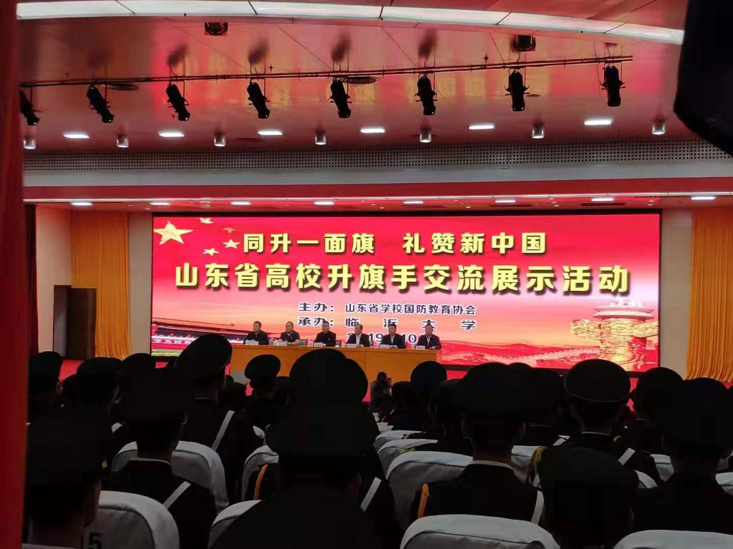 为深入贯彻落实党的十九大精神,庆祝中华人民共和国成立70周年,在学生中深化社会主义核心价值观和爱国主义教育,发挥学校国旗护卫队的教育引导作用,经省教育厅体育卫生与艺术教育处批准,山东省学校国防教育协会于10月11日— 14日,在临沂大学举办了首届山东省高校升旗手交流展示活动,我校英姿军事协会师生代表9人参加了活动。