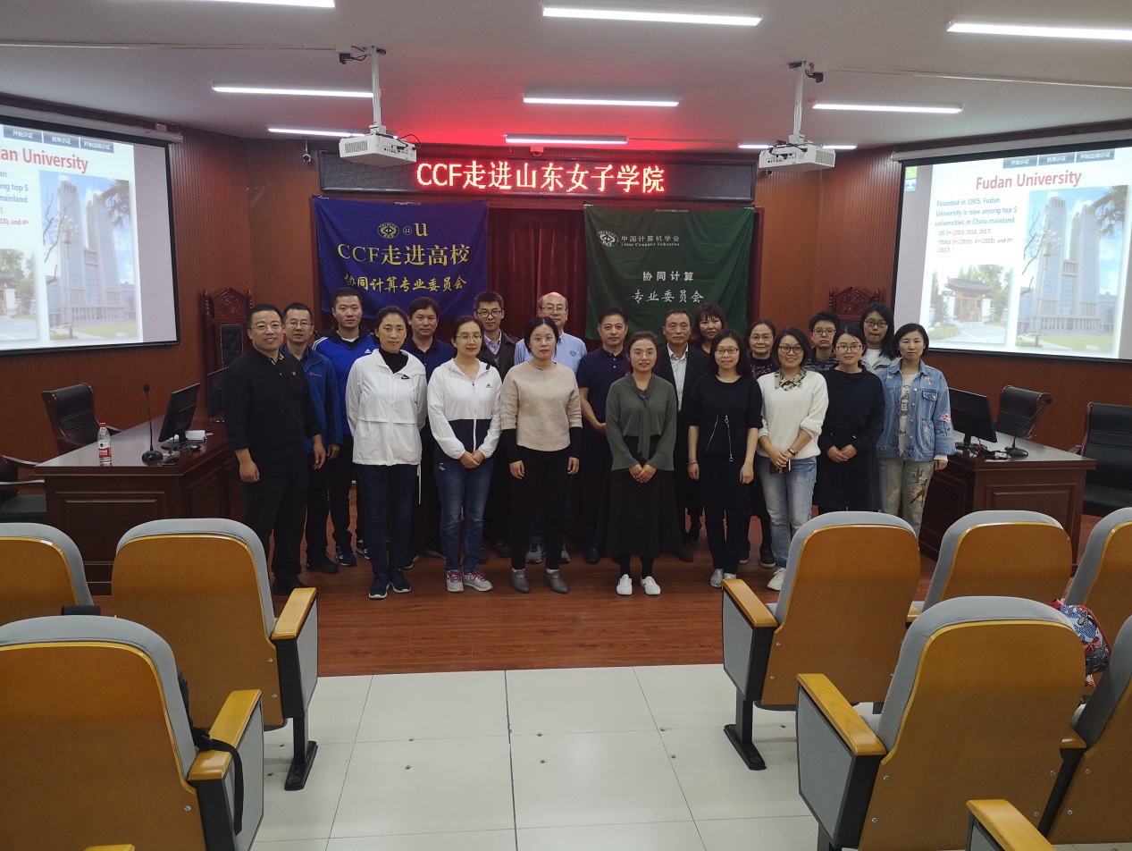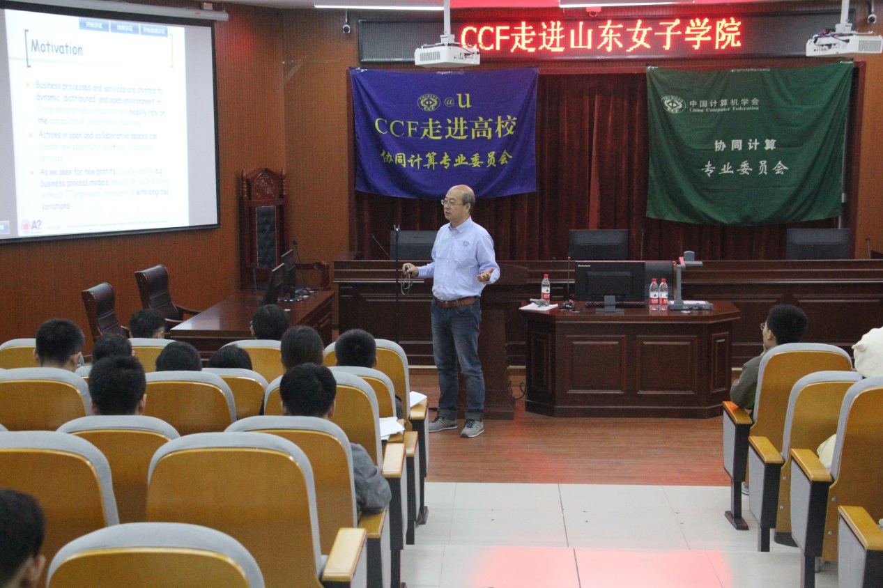 10月11日,由学校科研处、数据科学与计算机学院与中国计算机学会CCF合作,成功举办“CCF走进山东女子学院”活动。本次活动特邀CCF杰出会员、CCF协同计算专委主任、华南师范大学计算机学院院长汤庸教授,CCF高级会员、服务计算专委会委员、协同计算专委会委员复旦大学张亮教授做专题报告。经济学院、数据科学与计算机学院、经济学院、社会与法学院、教育学院等140余名师生参加了本次报告会。报告会由数据科学与计算机学院副院长孙洪峰主持。