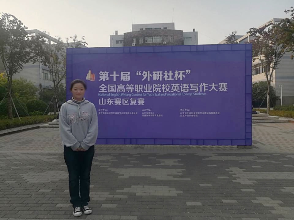 10月20日,由外语教学与研究出版社主办、教育部职业院校外语类专业教学指导委员会指导的第十届“外研社杯”全国高等职业院校英语写作大赛山东赛区复赛在青岛外贸职业学院隆重举行。全省共计75所学校报名参赛,172名选手进入复赛,其中,公共英语组141人,专业组30人。我校学生黄文凝作为公共英语组选手,在指导教师郑翠老师带领下赴青岛参赛,比赛中表现突出,荣获复赛山东赛区一等奖。