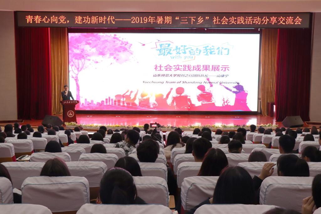 随后,各学院代表队进行交流展示。2019年学校共立项19支校级团队、20余支院级团队分赴菏泽、东营、淄博等地开展实践调研,8支团队与省妇联合办暑期创业训练营。各团队以PPT形式再现活动现场,他们从院部实际出发,发挥专业特色,积极开展关爱留守儿童、孤寡老人等活动,在实践中锻炼能力、充实自我。为了进一步对标对表,交流会特别邀请到山东师范大学悦创之行团队进行社会实践成果展示。团队队长山康宁介绍了悦创之行的运作方式和创新模式,从社会实践与学生竞赛相结合的角度为我们提供了社会实践的新思路,激励同学们以创新思维凝聚力量,以互助合作激发斗志,推动团队能力与水平提升。