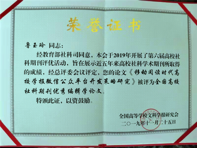 会议期间,研究会组织评审专家对参评的全国高校学报在学术质量、编校质量和出版质量等方面进行了审定、评比。《山东女子学院学报》被评为“全国高校社科优秀期刊”;“女性与社会发展研究”栏目被评为“全国高校社科期刊特色栏目”。《山东女子学院学报》原主编、机关党总支书记杨荣获“全国高校社科期刊优秀主编”奖,编辑鲁玉玲获“全国高校社科期刊优秀编辑学论文”奖,编辑赵莉萍获“全国高校社科期刊优秀编辑”奖。