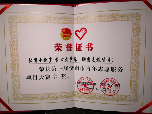 12月4日,由共青团济南市委、济南市文明办主办的第一届济南市青年志愿服务项目大赛在龙奥大厦举行。学校2个项目从全市各志愿服务组织报送的159个项目中脱颖而出,斩获金奖1项、银奖1项。