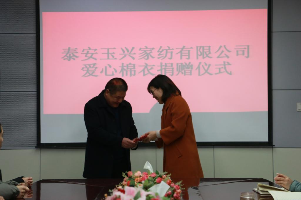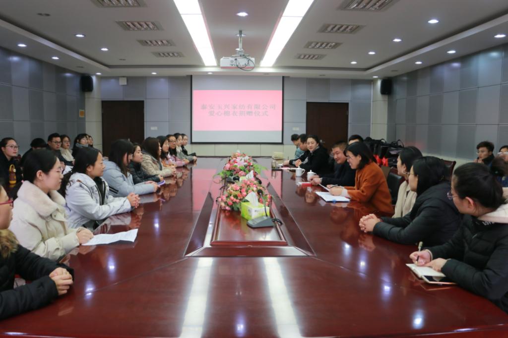 12月18日上午,学校在第三会议室举行泰安玉兴家纺有限公司爱心棉衣捐赠仪式。泰安玉兴家纺有限公司总经理侯庆余出席,学生处负责人、部分负责资助工作辅导员及获助同学代表到会参加。