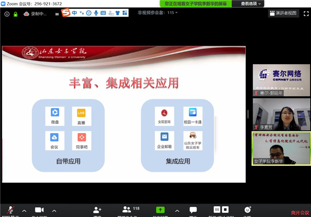 近日,赛尔网络有限公司山东分公司组织举办第三期教育网线上沙龙活动。本次活动邀请山东建筑大学、山东女子学院、山东理工大学信息化建设主管部门负责人进行主题交流发言。我校网络信息中心全体人员同来自全省高校信息化相关部门的130多名人员一起通过ZOOM视频会议参加了此次活动。