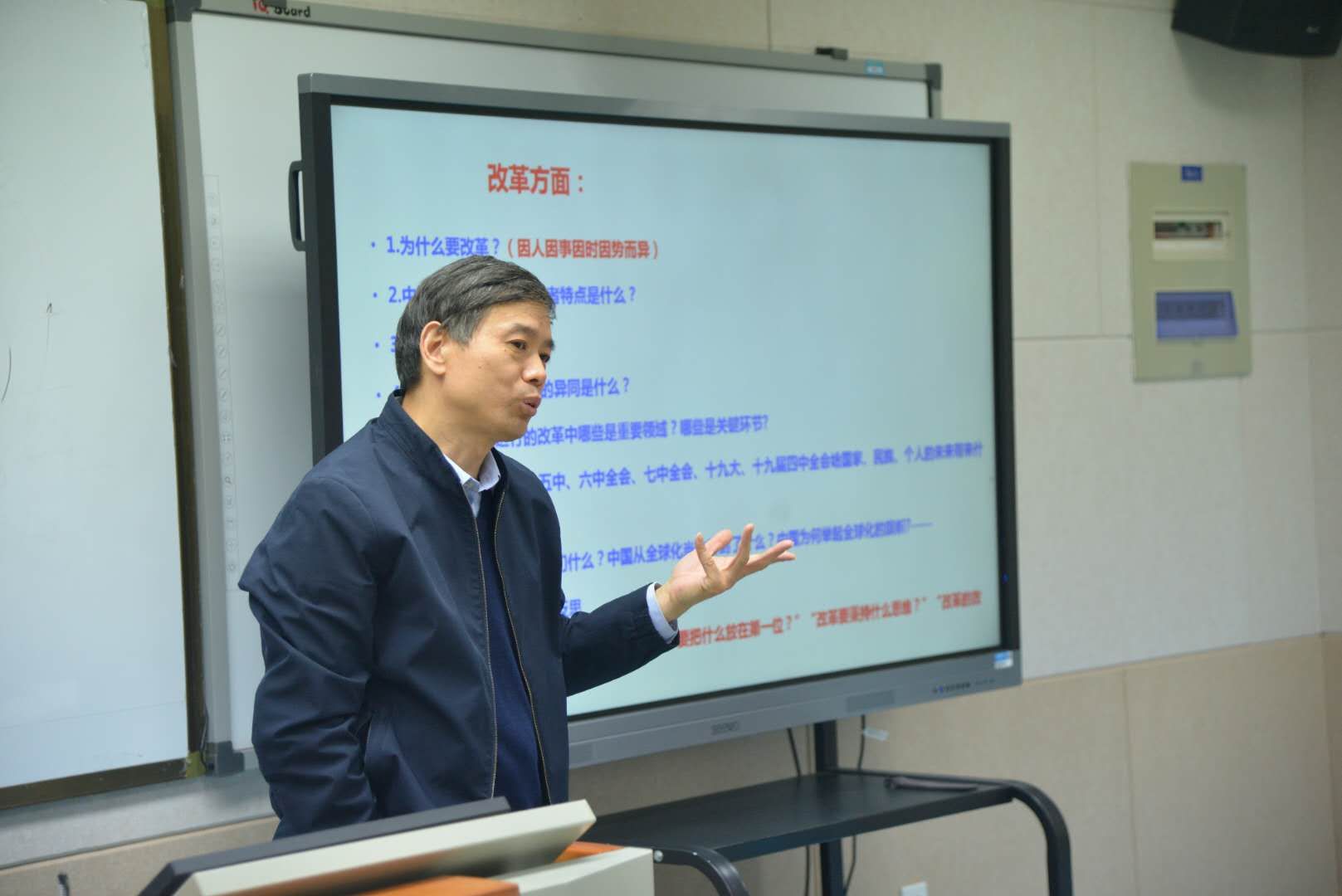 报告会上,李朋忠教授讲授了一堂思政示范课,以其深厚的理论功底、扎实的教学基本功、富有激情的语言表达展示了思政课应有的理论深度和情感温度,以及触动学生心灵、提升学生境界、引领学生发展的针对性和实效性。李朋忠教授结合自己多年来的思政课教学经验,讲述了“如何做一个好老师”的思考,阐发了教学工作必须把握好的“八个环节”,以及如何处理好教材体系与教学体系、教材主导与学生主体、课堂主阵地与课下辅阵地等“六大关系”。李朋忠强调,思政课教师要发挥“会讲故事”“讲好故事”的精神感召力,弘扬主旋律、传播正能量,引导学生追求真善美。他建议青年思政课教师多读书、读经典,多做研究、筑实功底,尊重学生、呵护学生理想情怀,使个人的教学超越“知识传授”的层面,上升为“方法指导”和“提高境界”的更高层面,尽快形成自己的教学个性和教学风格。