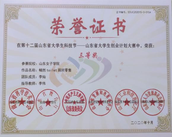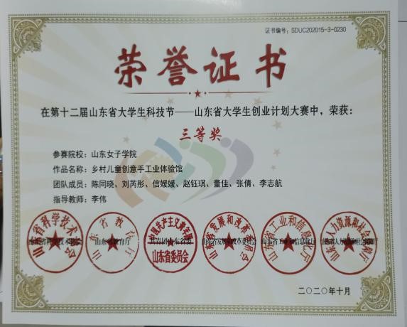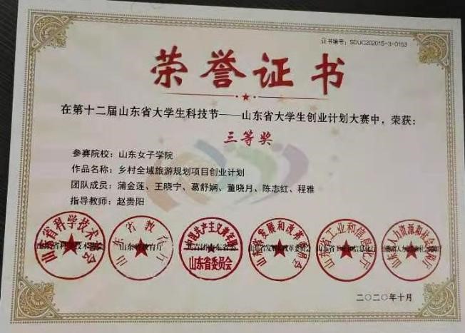 10月31日,第十一届山东省大学生创业计划大赛公布大赛获奖名单公布,我校共有三个作品获奖,其中我校创新创业学院陈同晓、刘芮彤等同学的“童心体验、麦田印象”乡村文化儿童创意DIY手工体验馆,李灿同学的“畅然toilet厕所零售”,旅游学院蒲金莲、王晓宁等同学的“乡村全城旅游规划项目创业计划”在本次大赛中荣获省级三等奖。