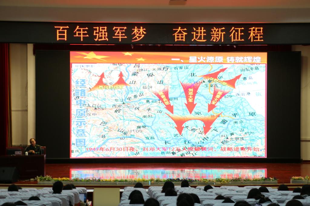刘鹏从星火燎原铸就辉煌、巩固国防坚强军队、改革开放富国强军、铸魂砺剑聚焦打赢四个方面讲述了在中国共产党的领导下,人民军队发展壮大的光辉历程和取得的辉煌成就,勉励同学们居安思危,深刻认识加强国防建设的重要性。