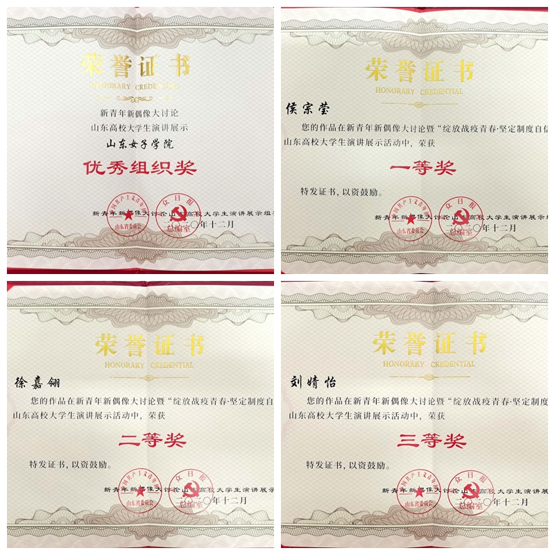 日前,由共青团山东省委、大众日报、山东高校学生教育与管理研究会面向全省高校大学生举办的“新青年新偶像大讨论”暨“绽放战疫青春,坚定制度自信”高校大学生演讲展示活动成绩揭晓。经学校选拔、网络投票、评委打分等环节,三名学生分别荣获一、二、三等奖,学校荣获“优秀组织奖”。