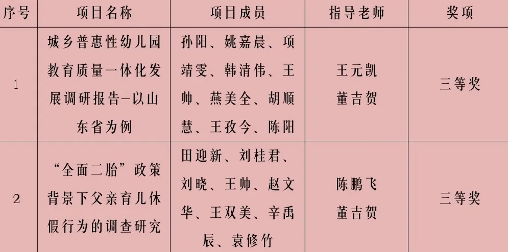 在由共青团山东省委、山东省科技厅、山东省科协、山东省教育厅、山东省学联主办的第十七届“挑战杯”山东省大学生课外学术科技作品竞赛省级选拔赛中,教育学院申报的《城乡普惠性幼儿园教育质量一体化发展调研报告——以山东省为例》(王元凯、董吉贺指导)和《育儿参与视角下父亲育儿休假行为的调查研究》(陈鹏飞、董吉贺指导)两项作品双双获得省级三等奖。