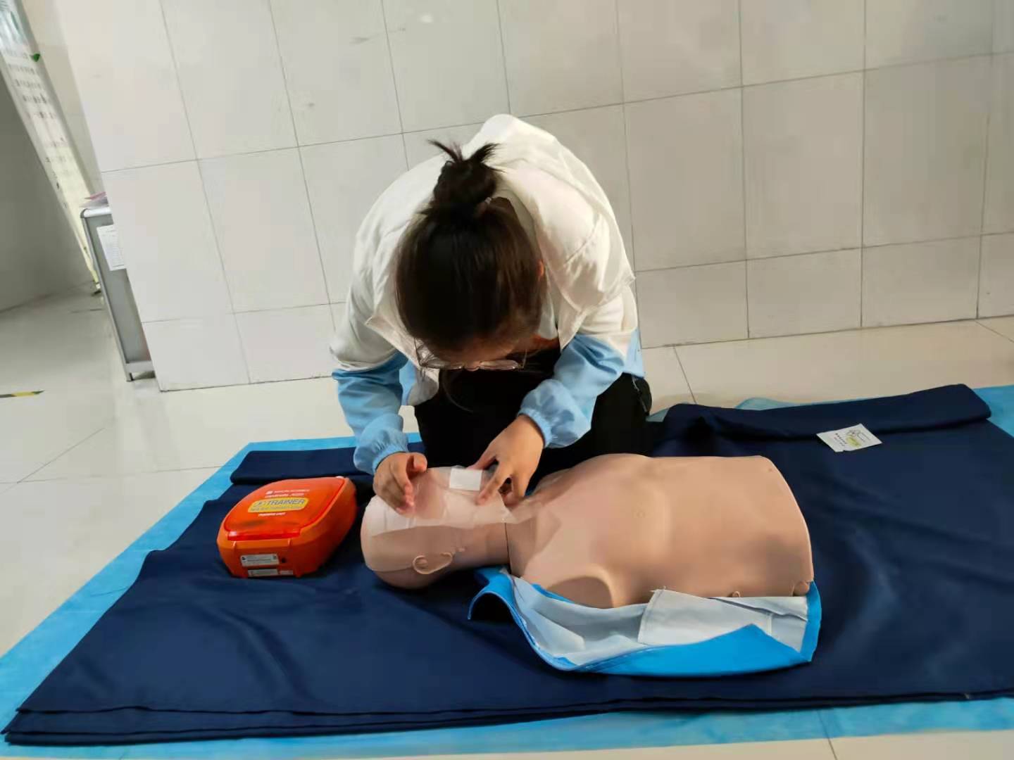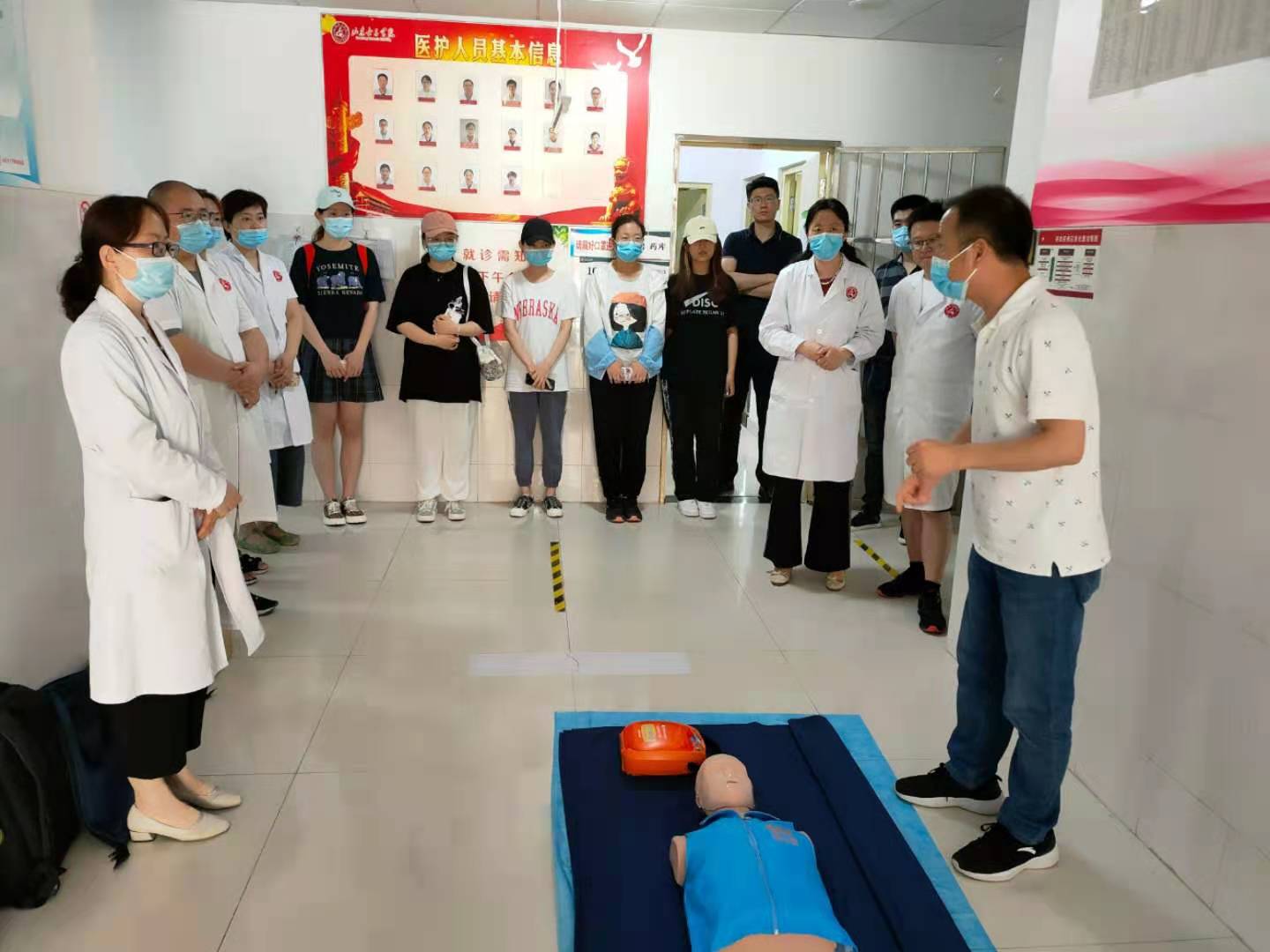 培训分为理论教学和实践操作两部分,内容主要涉及CPR(心肺复苏术)及AED(自动体外除颤仪)的使用。急救讲师讲授基本理论知识后,手把手地对参与人员通过仿真人模进行操作示范,现场指导师生操作并纠正错误动作,现场师生积极参与其中,认真学习相关知识。