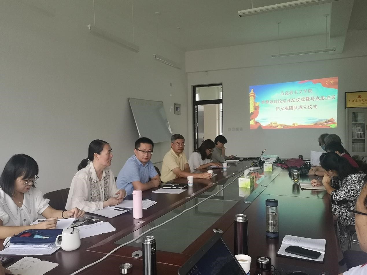 为提升马克思主义学院教师科研水平,进一步推动马克思主义理论学科发展,充分彰显新时代下学院思政育人特色,落实立德树人根本任务,9月16日下午,马克思主义学院举行博雅思政论坛开坛暨马克思主义妇女观团队成立仪式。妇女研究和发展中心叶文振教授、王慧教授应邀出席,科研处相关负责人及学院全体教师参加会议。