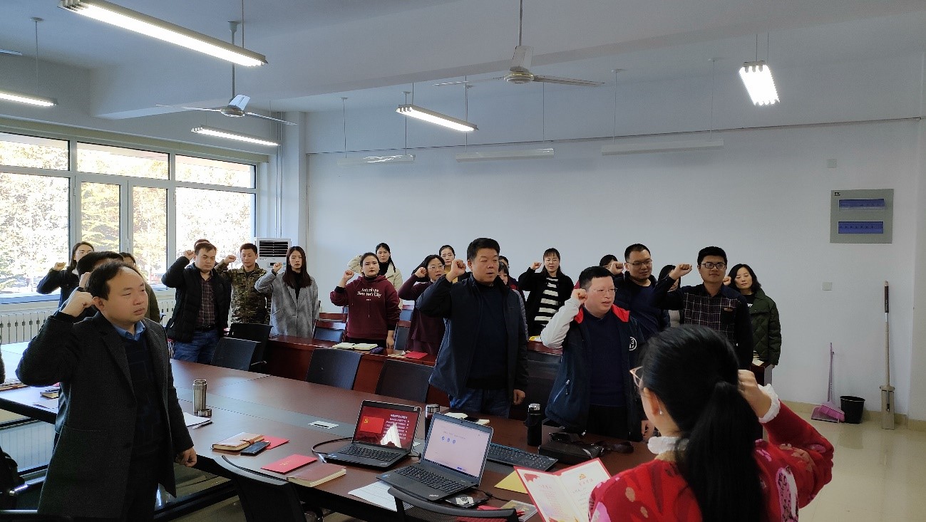 活动中,各支部书记分别向18名过政治生日的党员同志赠送了“政治生日”贺卡,希望党员们在工作中敢于亮身份、显担当,充分发挥党员的先锋模范作用。随后学院党委书记吕建国同志送上“政治生日”赠言,希望党员们更加体会到“珍惜”、“责任”和“感恩”六个字的真谛。同时也希望各位党员同志时时刻刻以一名共产党员的标准来严格要求自己,珍惜自己的政治生命,对得起组织的培养、领导的信任,用强烈的责任心统领思想和行动,用感恩的心对待组织,对待同事,对待他人,共同维护“家”的氛围。随后,全体党员面向党旗庄严宣誓,重温入党誓词,并一起合唱了歌曲《没有共产党就没有新中国》,最后全体党员同志共同签订承诺书。