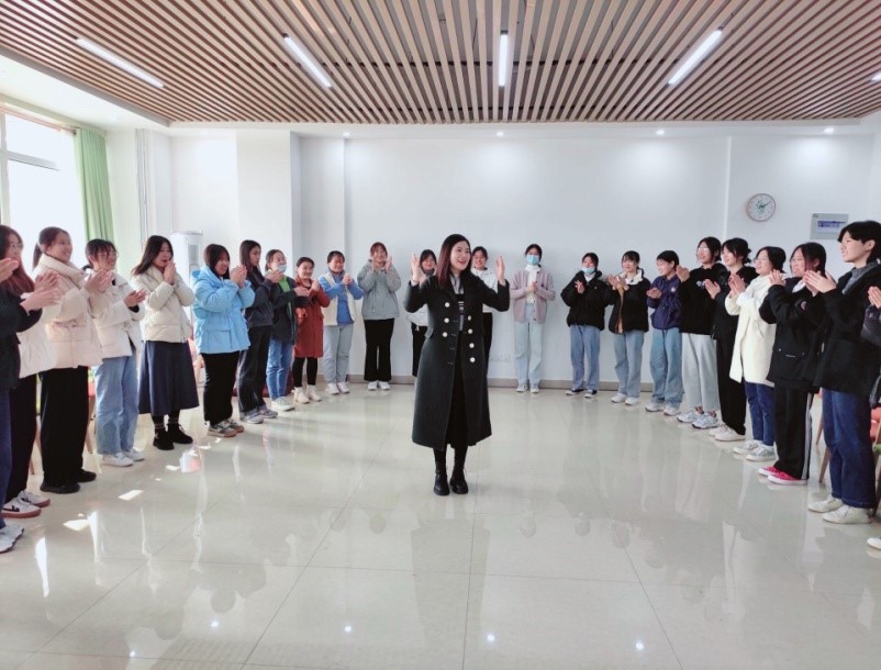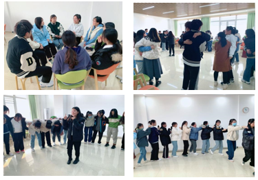 赵文文老师带领同学们一起做拍拍操,营造一种轻松愉快的团体氛围。随后,把全班同学打破宿舍小团体,分成4个小组,做“滚雪球”式自我介绍,让学生跳出舒适圈,快速熟悉团体中的每一个小伙伴。生日时钟和桃花朵朵开既考验大家的团队协作能力、反应能力,也能给大家创造更多拉进关系的小契机,有同学发现了和自己同一天生日的小伙伴,有的同学因为一点小差错要和其他小伙伴一起表演节目,活动过程中充满欢声笑语,团体动力进一步增强。活动最后,大家互相搭起肩来,共同组建一个大家庭,彼此分享在活动中的体验。